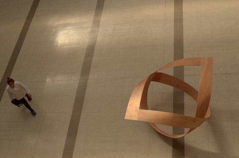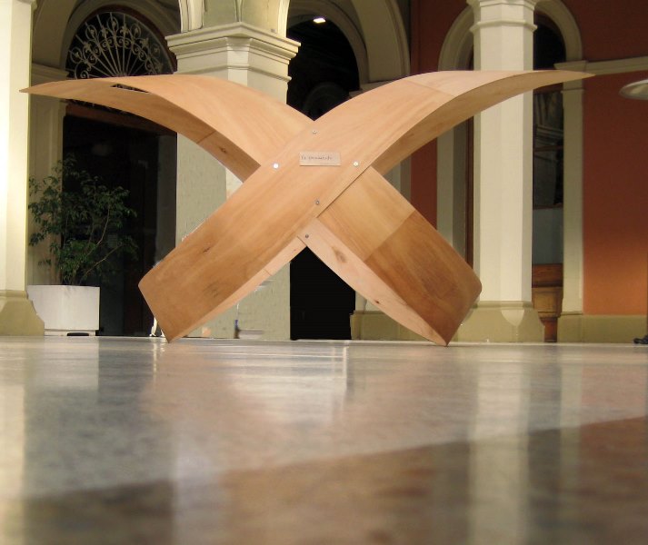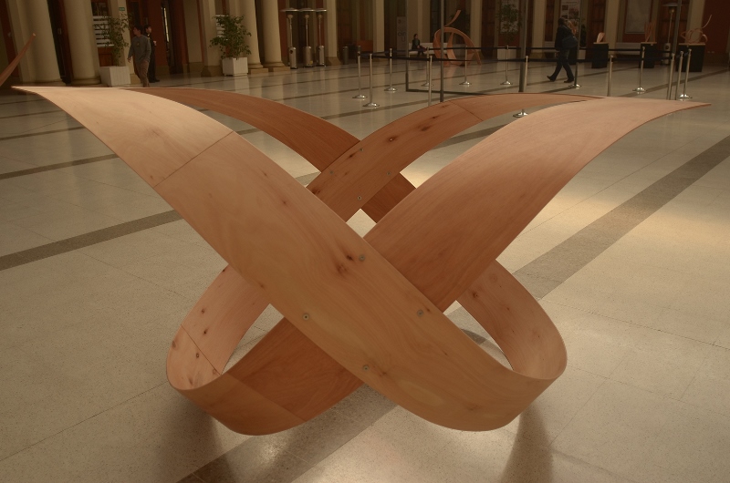 Los caminos de la creación son misteriosos e insospechados para el hombre. Su transitar es vertiginoso y confuso, de ahí el acento artístico por capturar el recorrido del andar bajo el cambio de lo desconocido. Maderas contrapuestas en un sentido y otro para formar el camino que dirige su punto de origen en una coherencia del devenir eterno. La obra exige moldear el material conforme se realizan los lineamientos y acentuaciones propias de nuevas rutas, invitando a conectarse con su entorno, mediando las diversas fuerzas que confluyen.”