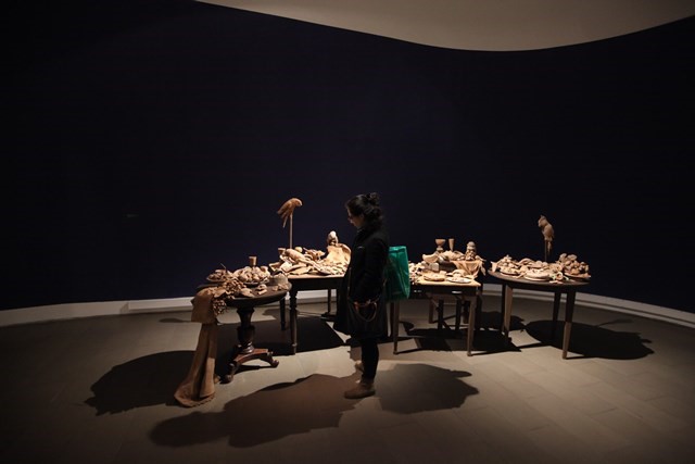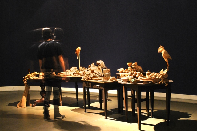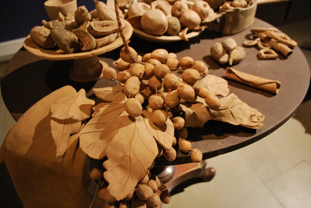 Siguiendo la relación entre la comida y la imagen artística, la artista llegó a las naturalezas muertas del siglo XVI y XVII, donde encontramos un sinfín de representaciones de escenas de mesas servidas, de desayunos y meriendas. Se interesó, entonces, en crear una tensión entre el barro y lo que las pinturas representaban de manera tan solemne y fastuosa. Investigó escenas barrocas de las pinturas de Adrien van Utrect, también los bodegones clasificados como monochrome banketejs, pensando en que si los objetos eran de barro o greda, podrían ser similares a los que encontramos en aquellas pinturas: platos, panes, limones, higos, copas, frutos. La ausencia de brillo y color proporcionaría una atmósfera alicaída y poco apetitosa a la escena total.