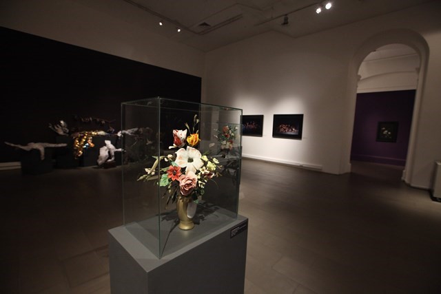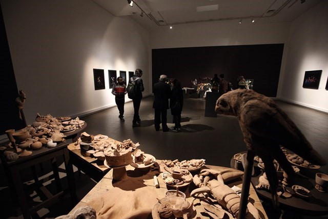 En la exposición se incluyen fotografías construidas con los objetos realizados que forman escenas similares a las que encontramos en las naturalezas muertas. Por ser la fotografía una imagen que se puede manipular en términos visuales, los resultados están más asociados a la publicidad, es decir, imágenes muy limpias, luces y atmósferas controladas que priorizan artificiosamente la precariedad de los elementos dispuestos. El montaje de la muestra está pensado para introducir al espectador en una gran escena conformada por diferentes secciones. En ella, el trabajo atmosférico teatralizado pretende involucrar al visitante en el escenario de la abundancia.